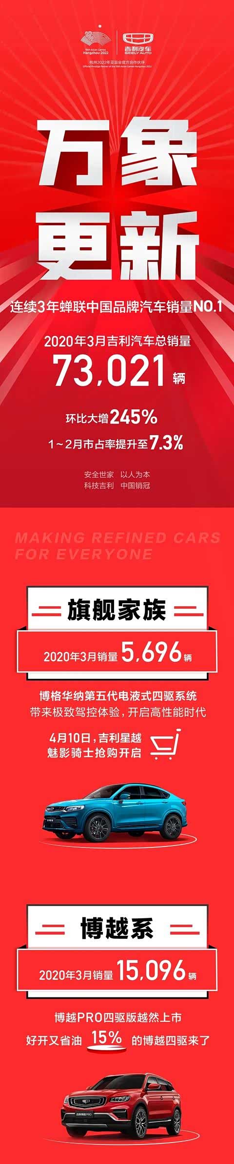 吉利汽车3月销量达73,021辆,环比大幅增长245%1-2月市占率提升至7.3%多款车型单月销量破万。